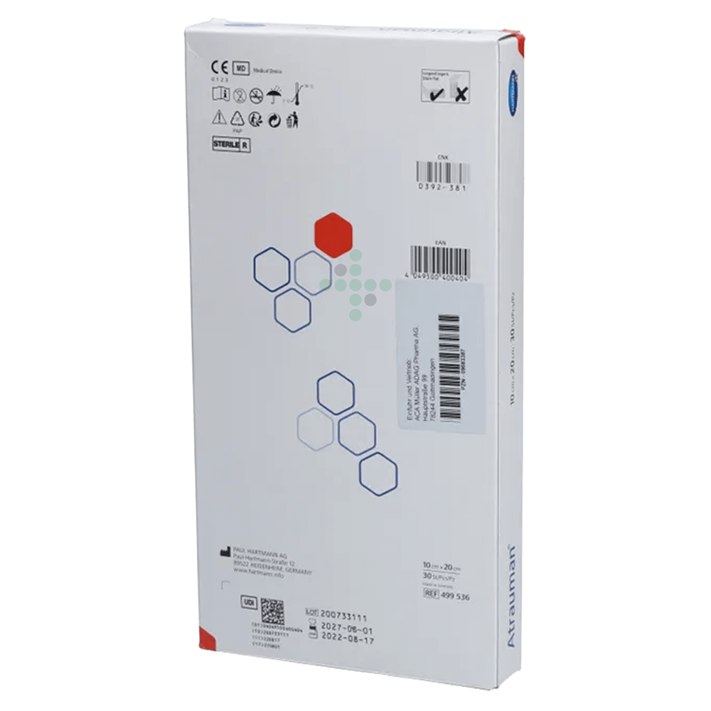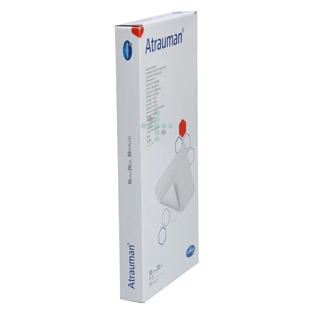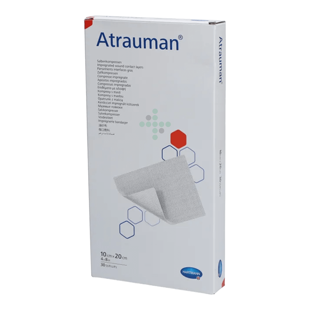 Atrauman 10×20 cm, 30 ks - mastný tyl na rany, je sterilný hydrofóbny polyesterový tyl s drobnými okami pre moderné hojenie rán. Podporuje granuláciu, avšak veľkosť jednotlivých ôk zamedzuje prerastaniu novo vznikajúceho tkaniva – tým eliminuje vznik hypergranulácií. Výrobok je utkaný z hladkých vlákien, ktorá sa nelepí k spodine rany. Je impregnovaný neutrálnou lanolínovou masťou, Atrauman tak umožňuje šetrný preväz rany. Atrauman možno použiť na drobné odreniny, tržné rany s malou sekréciou a pomliaždeniny.