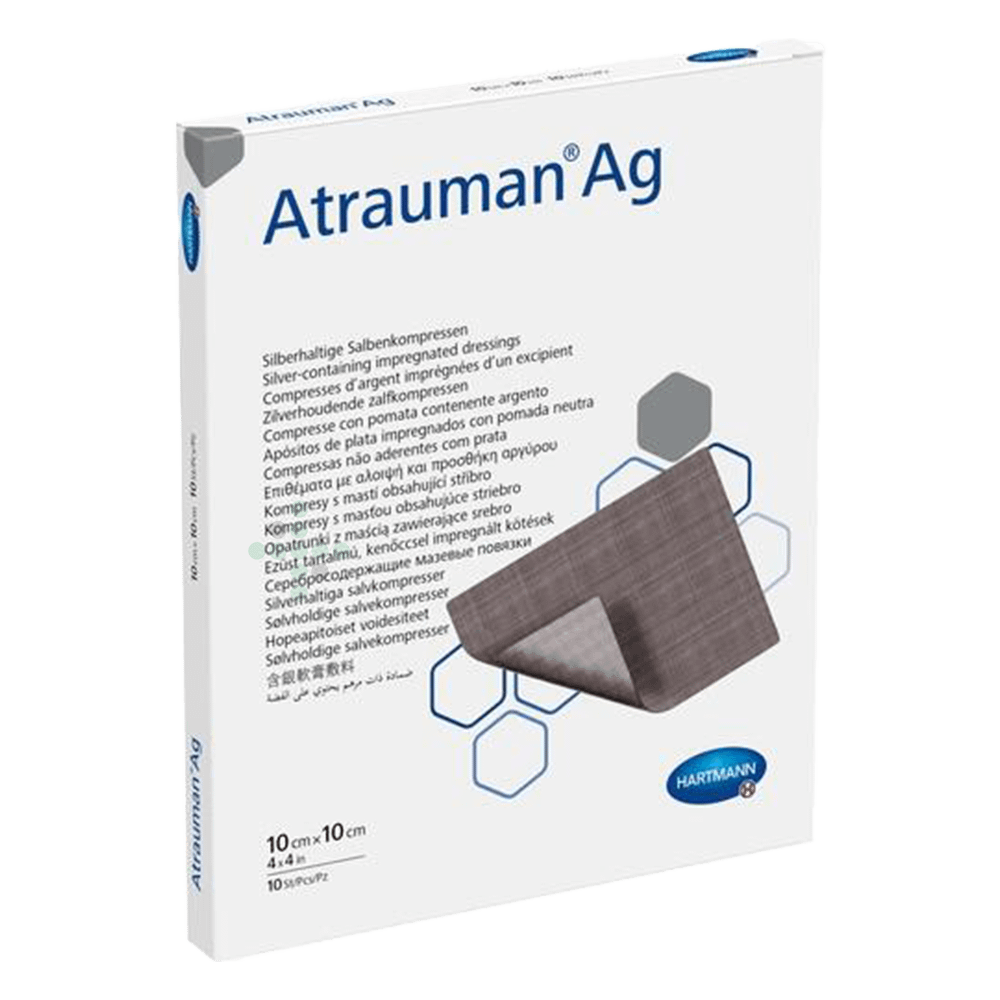 Atrauman 10 x 10 cm, 10 ks - mastný tyl na rany s obsahom striebra, je sterilný hydrofóbny polyesterový tyl s drobnými okami pre moderné hojenie rán. Podporuje granuláciu, avšak veľkosť jednotlivých ôk zamedzuje prerastaniu novo vznikajúceho tkaniva – tým eliminuje vznik hypergranulácií. Výrobok je utkaný z hladkých vlákien, ktorá sa nelepí k spodine rany. Je impregnovaný neutrálnou lanolínovou masťou, Atrauman tak umožňuje šetrný preväz rany.