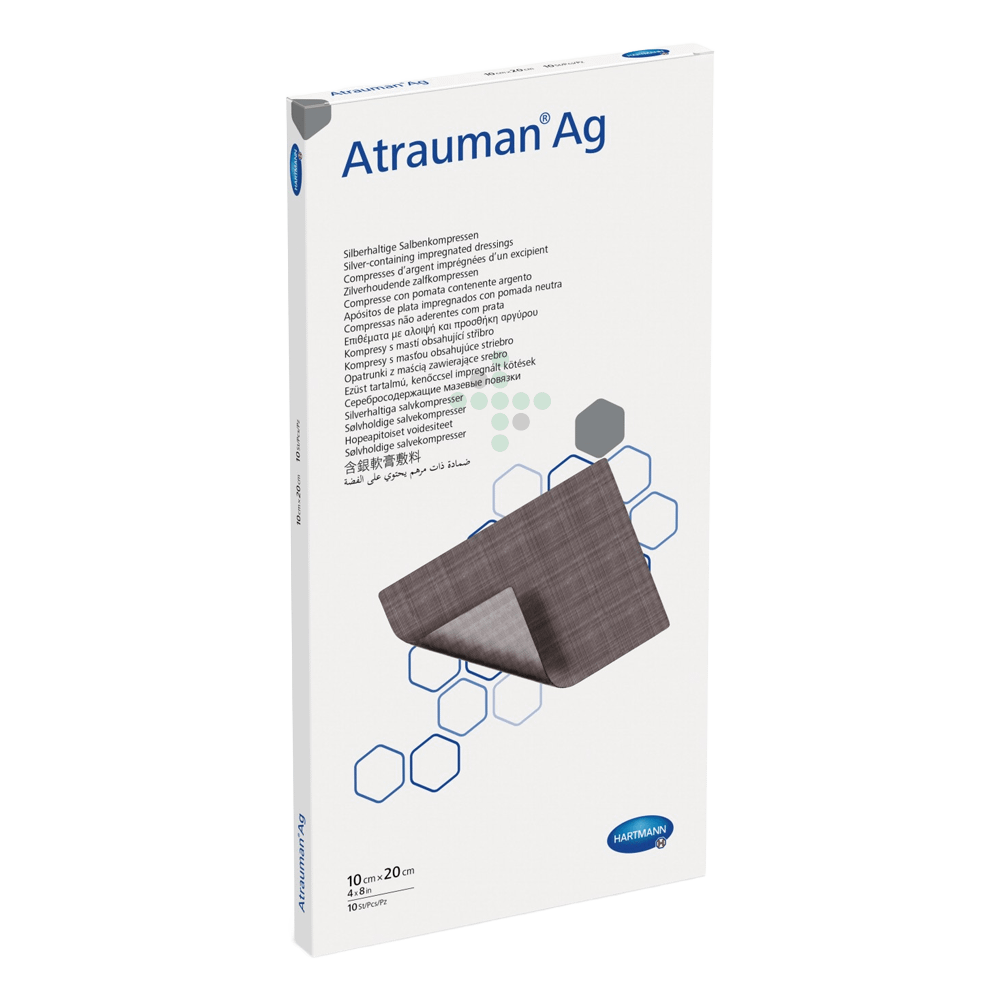 Atrauman AG 10 x 20 cm, 10 ks – mastný tyl na rany s obsahom striebra, je sterilný hydrofóbny polyesterový tyl s drobnými okami pre moderné hojenie rán. Podporuje granuláciu, avšak veľkosť jednotlivých ôk zamedzuje prerastaniu novo vznikajúceho tkaniva – tým eliminuje vznik hypergranulácií. Výrobok je utkaný z hladkých vlákien, ktorá sa nelepí k spodine rany. Je impregnovaný neutrálnou lanolínovou masťou, Atrauman tak umožňuje šetrný preväz rany.