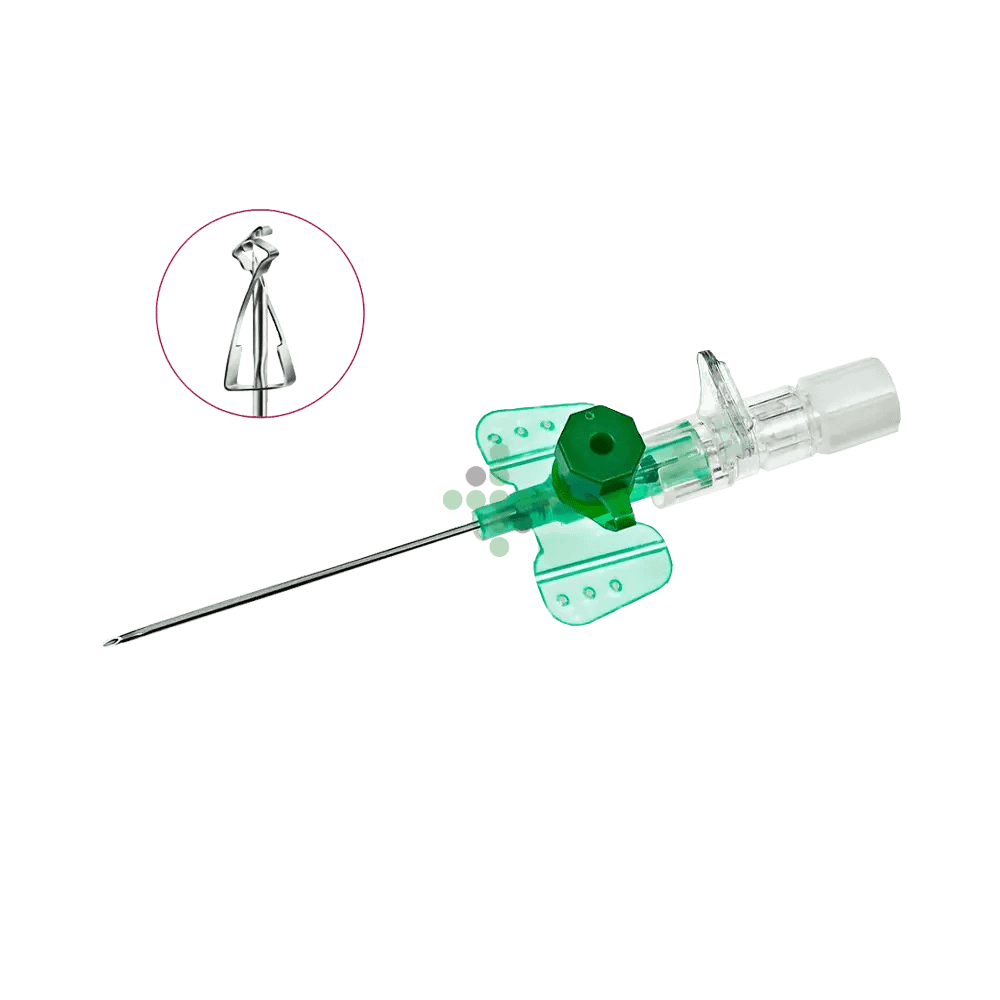 - Príslušenstvo: fixačné krídelká, injekčný port s jednocestným ventilom, bezpečnostný mechanizmus ihly