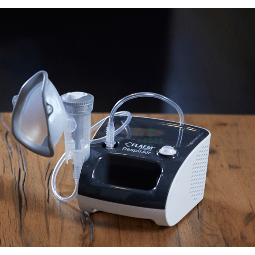 FLAEM domáci inhalátor/ nebulizér RespirAir je vysoko výkonný certifikovaný pneumatický piestový inhalátor určený na liečbu horných aj dolných dýchacích ciest. Je ideálny na časté domáce použitie pre celú rodinu, vrátane detí a seniorov, vďaka jednoduchej obsluhe a bohatej výbave. Vďaka spoľahlivému kompresoru a nebulizátoru RF7 Dual Speed Plus zabezpečuje rýchlu a efektívnu inhaláciu s možnosťou prispôsobenia rýchlosti podľa potrieb používateľa.