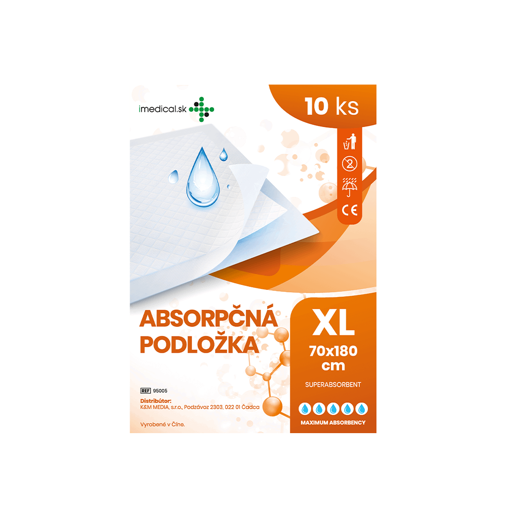 Absorpčná podložka 70x180cm so superabsorbentom má vrchnú savú vrstvu z jemnej a na dotyk príjemnej netkanej textílie, spodnú nepriepustnú vrstvu tvorí PE fólia s protišmykovou úpravou.