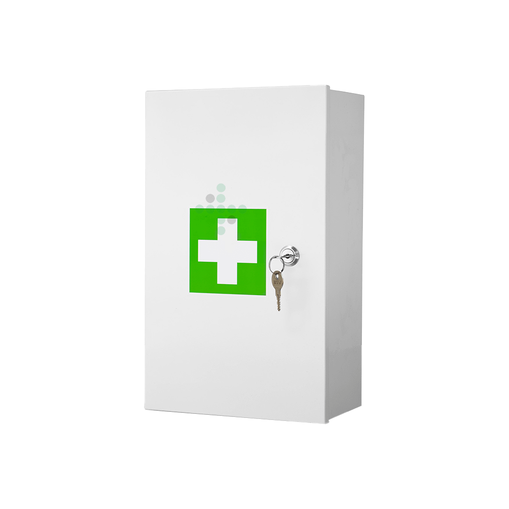 S možnosťou upevnenia na stenu a uzamykaním, čím je obsah lekárničky chránený pred odcudzením. Označená bielym krížom v zelenom poli pre rýchlejšiu orientáciu a nájdenie miesta s prostriedkami prvej pomoci.