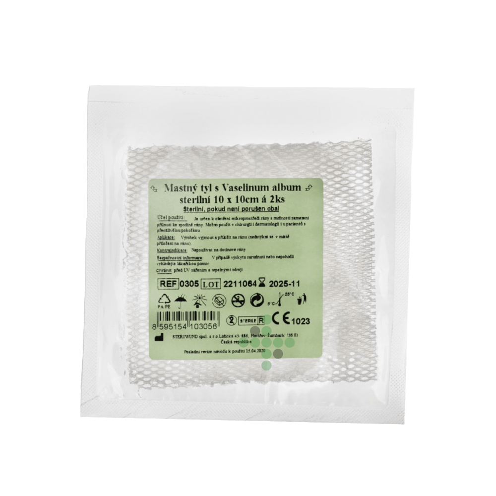Sterilný mastný tyl je vyrobený z vysoko porézneho hydrofóbneho obväzu z polyesterového hodvábu, ktorý slúži ako nosič masťovej hmoty – Vaselinum album.