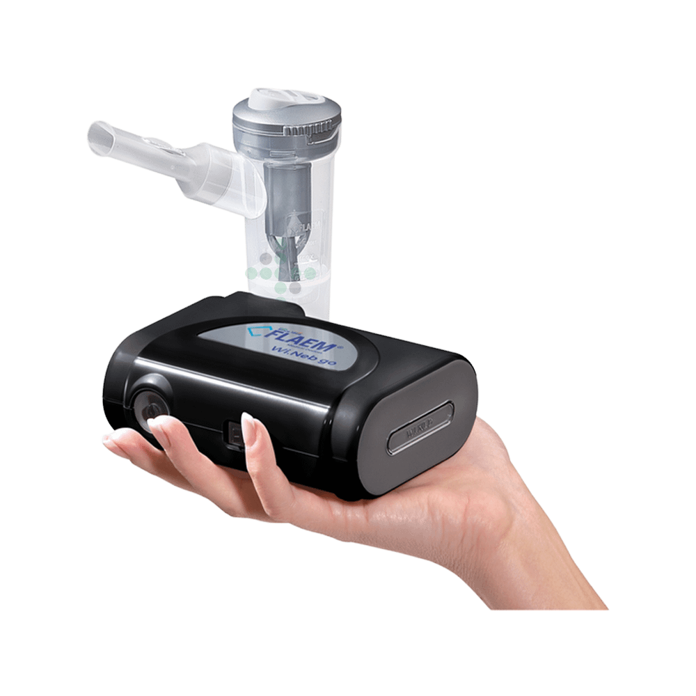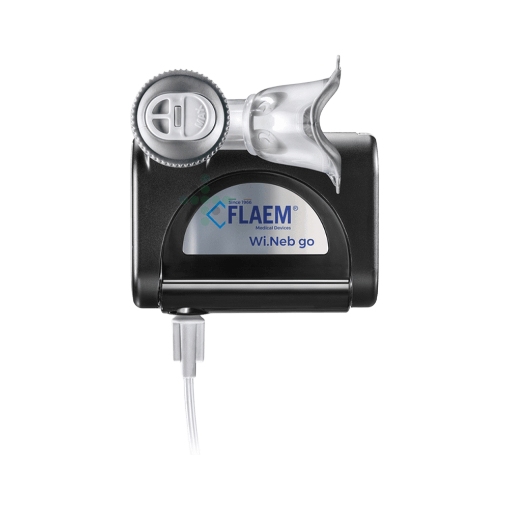 FLAEM Wi.Neb Go je ľahký kompresorový nebulizér / inhalátor určený na inhalačnú terapiu kedykoľvek doma ale aj na cestách . Lítiová batéria zabezpečí približne 45 minút chodu pričom plné nabitie batérie trvá približne 2 hodiny – zo siete, alebo zo zásuvky z 12 V v aute.