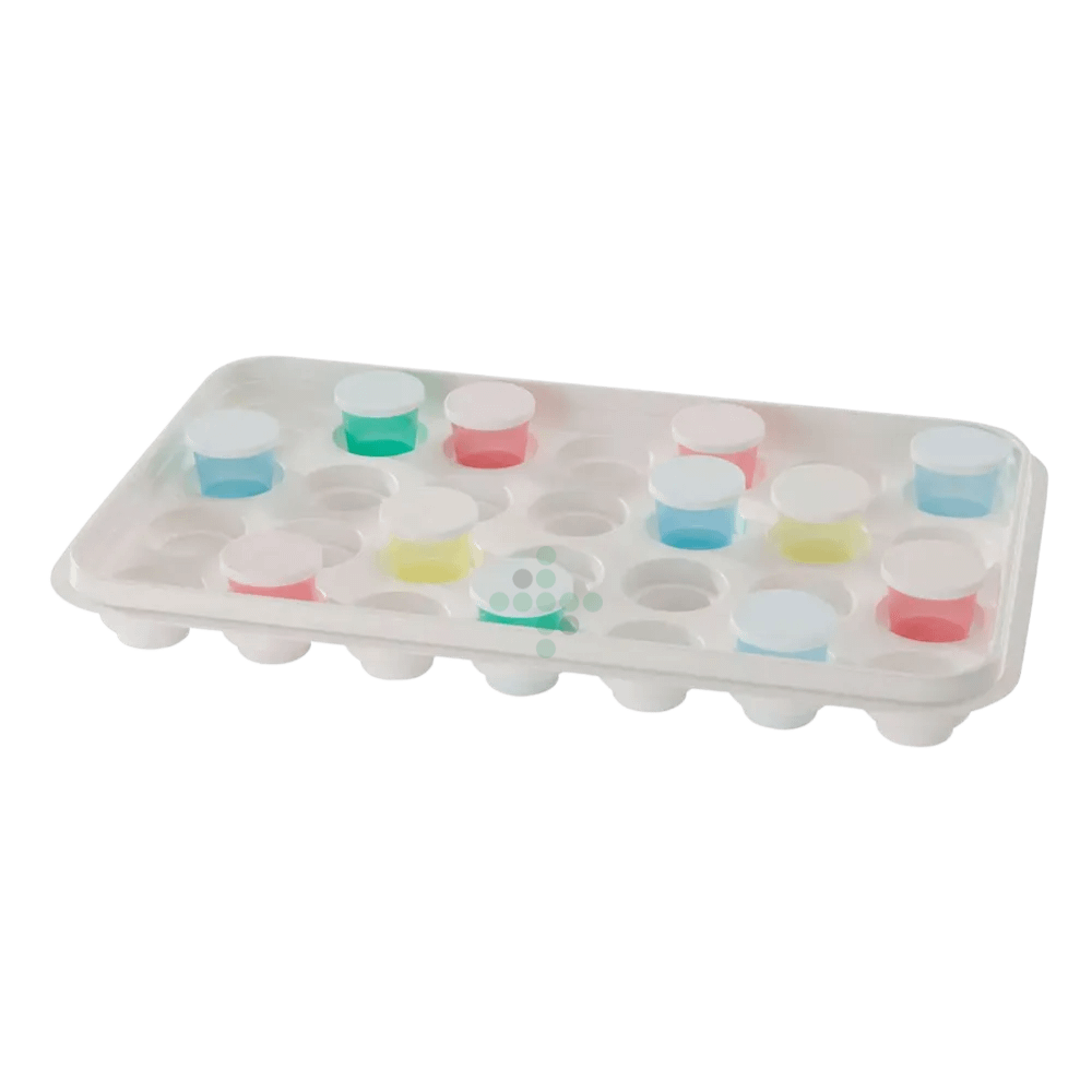 Polystyrénový podnos (tácka) na 28 pohárov na lieky, biely, v rozmere 375 x 225 x 40 mm. Kúpte si polystyrénovú tácku pre ľahkú manipuláciu s kelímkami pri výdaji liekov na oddelení.