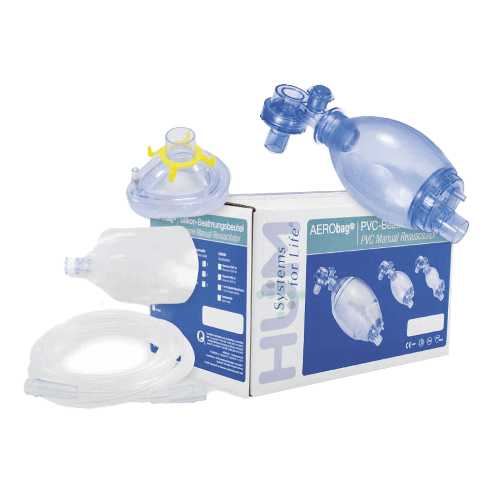 - Set obsahuje: ručný resuscitátor, kyslíkový vak z PVC 600ml, kyslíková hadička 2,1 m, PVC resuscitačná maska č.2