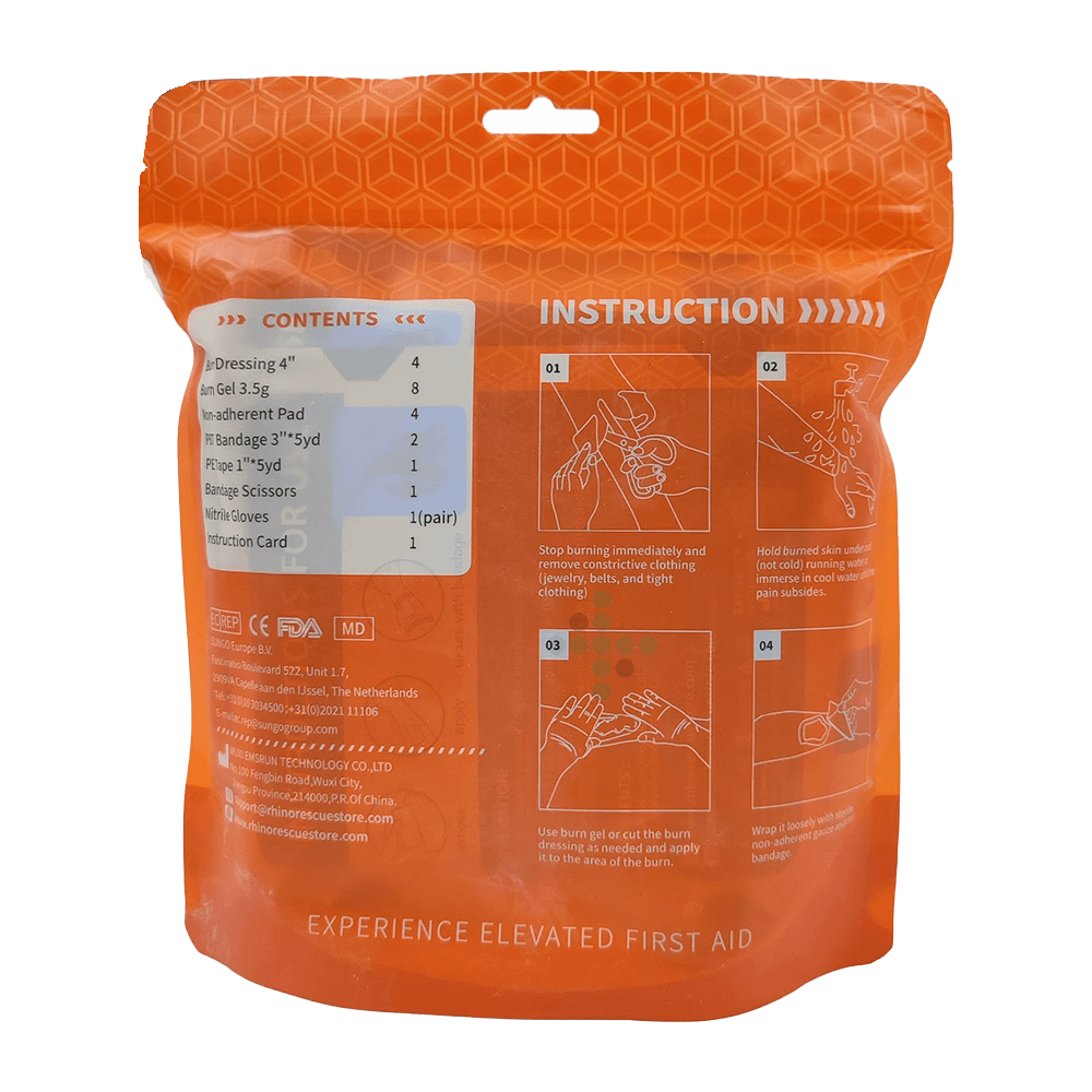 - Gélový obväz na popáleniny RHINO RESCUE zložený z vedecky formulovaného chladivého gélu a netkanej podložky pomáha zmierniť bolesť, ochladzovať popáleniny a chrániť pred kontamináciou. Obväzy sú namočené vo vodnom a biodegradovateľnom géli a sterilizované, aby sa zabezpečilo prostredie bez kontaminácie pri núdzovom ošetrení popálenín.