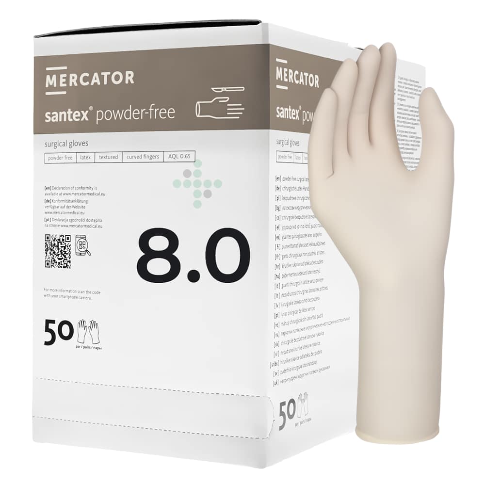 Rukavice SANTEX latex, nepudrované, chirurgické, sterilné. Jednotlivo balené – pár.