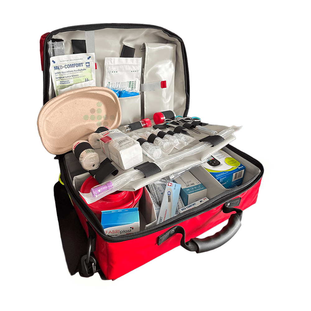 Hlavná časť variabilne nastaviteľná podľa potreby priehradkami na suchý zips. Priehľadné vrecko na dokumenty. Hlavná komora vo veku s veľkými uzatvárateľnými priehradkami a fixačnými slučkami Pohodlný a bezpečný transport zdravotného materiálu vďaka ergonomickej a pohodlnej rukoväti alebo čalúnenému ramennému popruhu. Chránená zosilnená spodná a zadná oblasť.