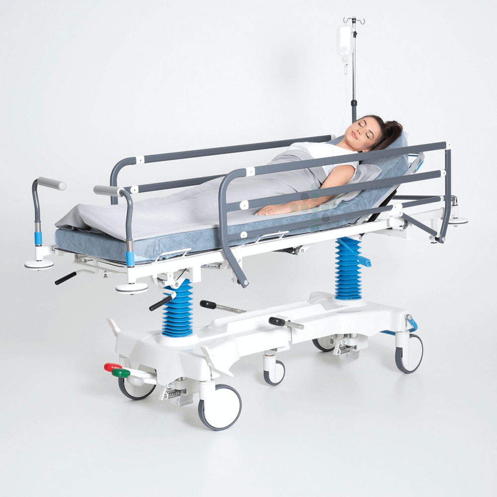 Lôžko je vybavené matracom z polyuretánovej peny s hrúbkou 80 mm, ktorý ponúka maximálne pohodlie a zároveň spĺňa vysoké hygienické štandardy. Nastavenie výšky, sklonu chrbta a nôh je jednoduché vďaka plynovým pružinám a ergonomickým ovládacím prvkom. Vozík obsahuje systém QuickBrake™, ktorý zabezpečuje okamžité a bezpečné zastavenie v prípade núdze.