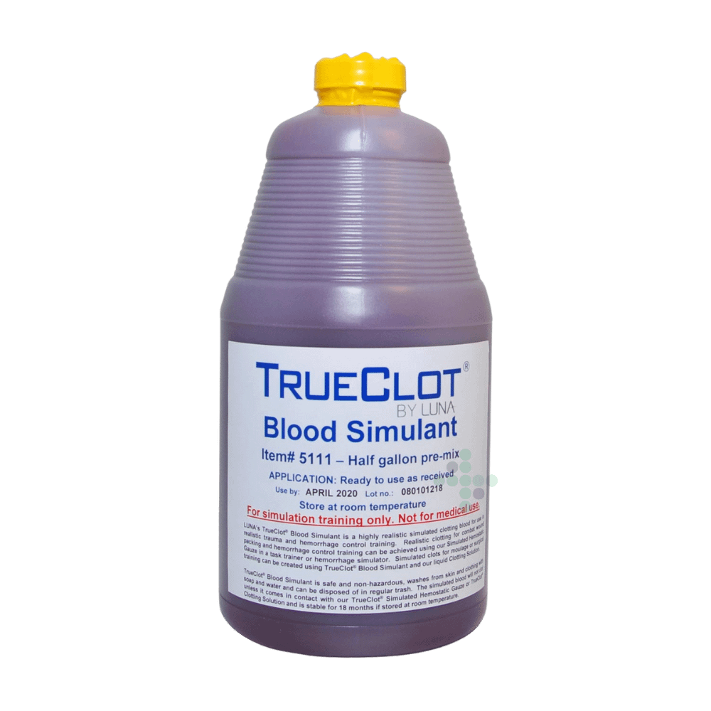 Simulovaná krv sa nezrazí, pokiaľ nepríde do kontaktu s tréningovou gázou TrueClot alebo koagulačným roztokom a môže sa skladovať 6-12 mesiacov pri izbovej teplote.