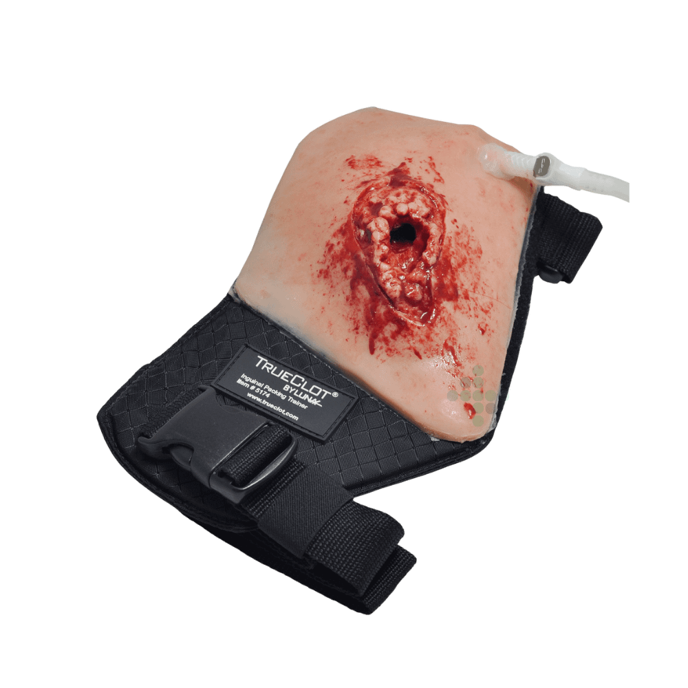 TrueClot Inguinal Trainer je prenosná tréningová pomôcka, ktorá simuluje krvácanie z tepny, ktoré sa nedá zastaviť škrtidlom, učí pokročilé zručnosti ošetrenia rán.