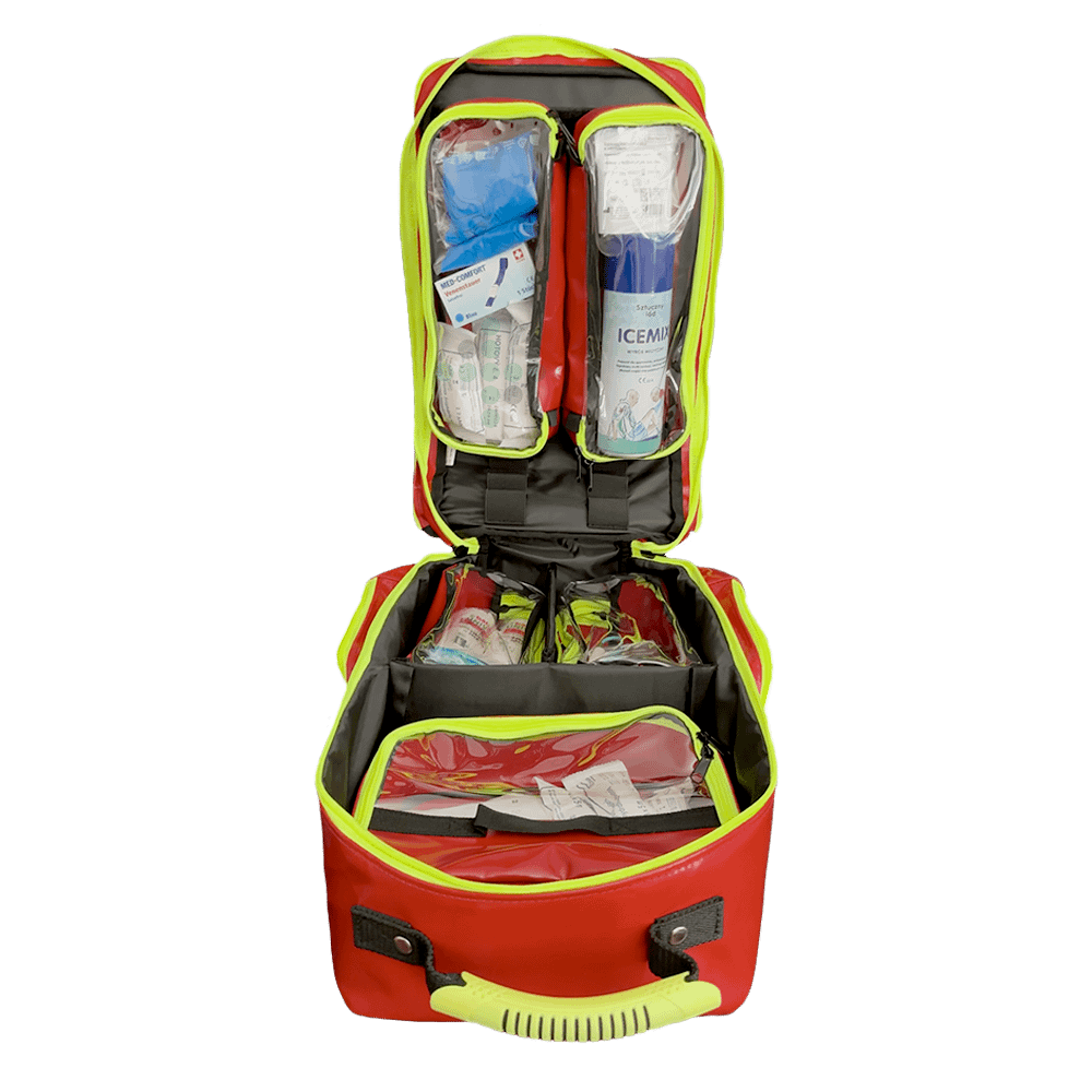 Záchranárska taška veľkosti L v červenej farbe, je vyrobená z odolného Plan materiálu. Taška je dodávaná s vybavením.