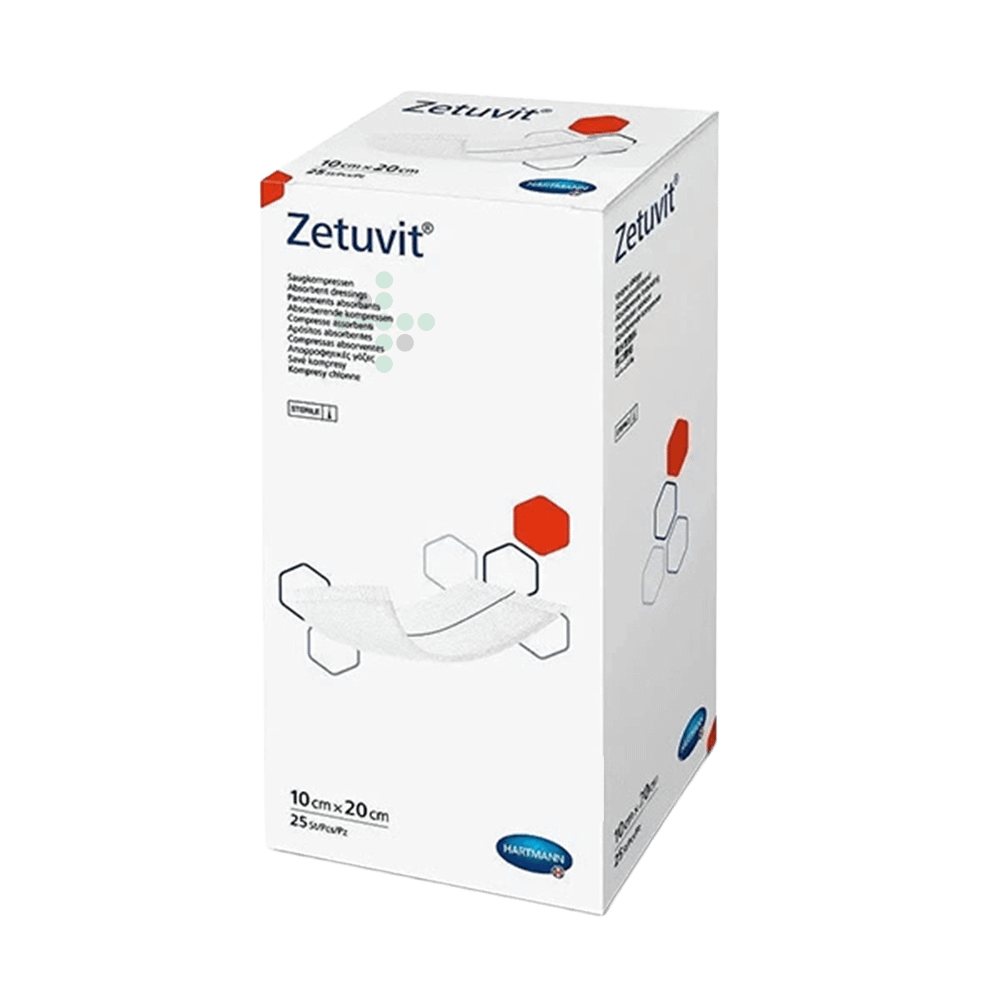 Zetuvit 10×20 cm, 25 ks – sterilný kompres, v balení po 25 ks.